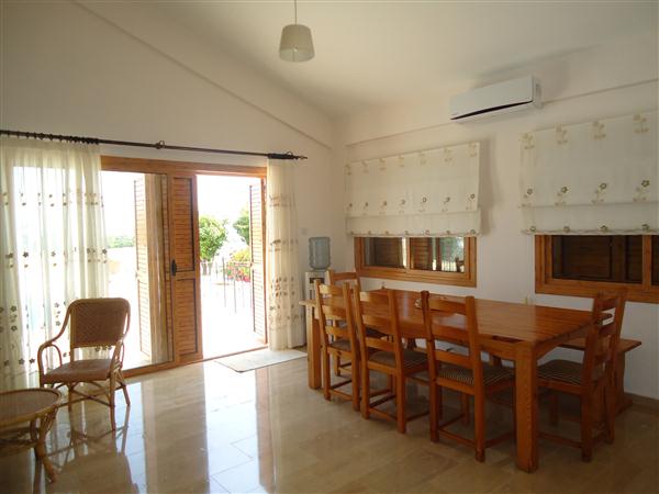 There is fully fitted modern kitchen with all the amenities you need. Just outside of the kitchen area is a large dining table seating up to 8-10 people. Fully Air Conditioned throughout.