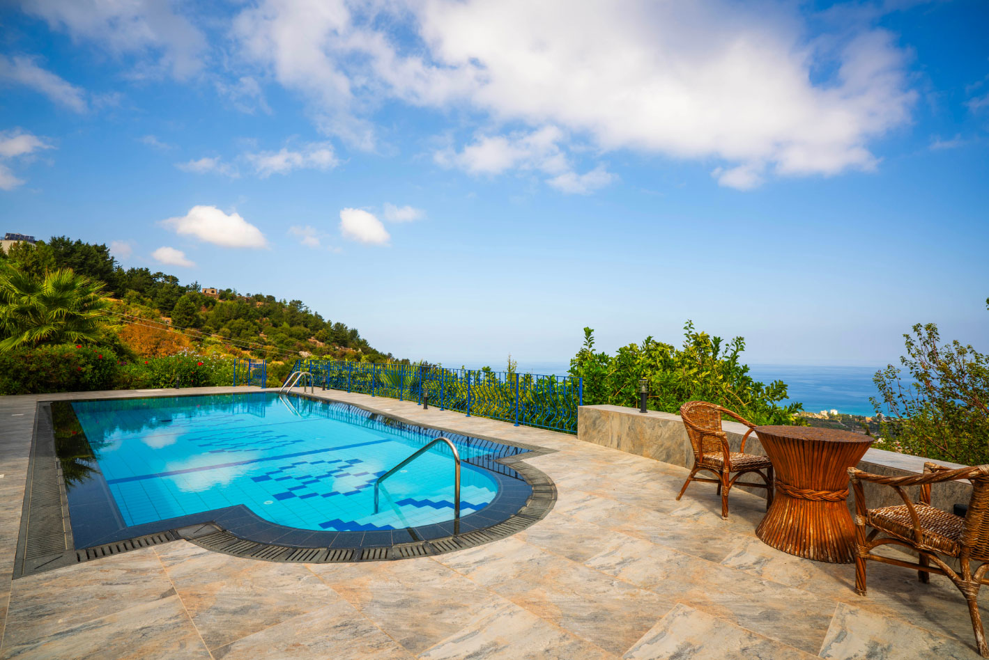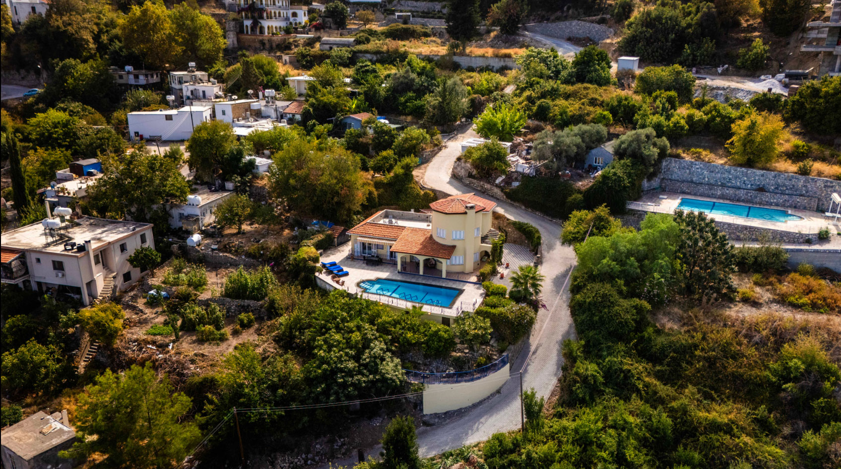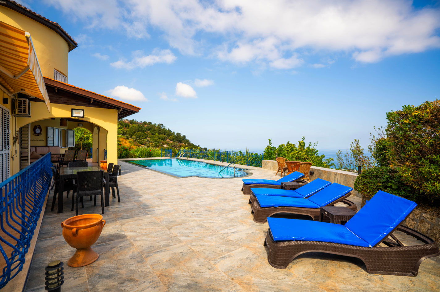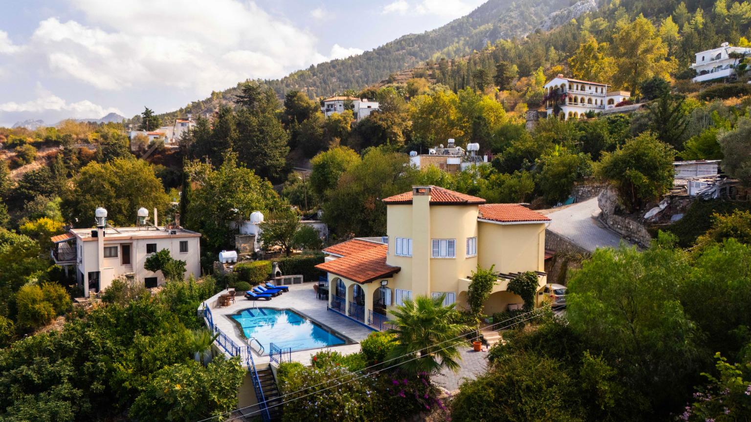 Set high in the mountains above the village of Baspinar, Lapta, Jewel Villa is a 4-bedroom lovely holiday villa offering spectacular panoramic views of the cost and surrounding village. The location is a drive up the mountain on a peaceful country lane. The villa offers 4 bathrooms with 3 en-suite, a swimming pool and a great outdoor area with covered terrace.