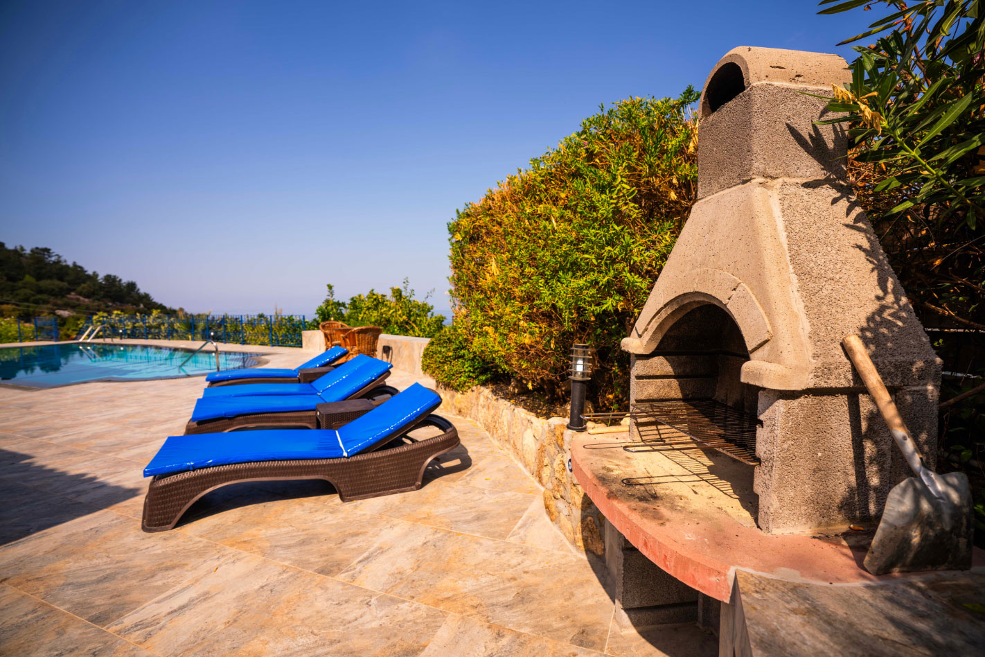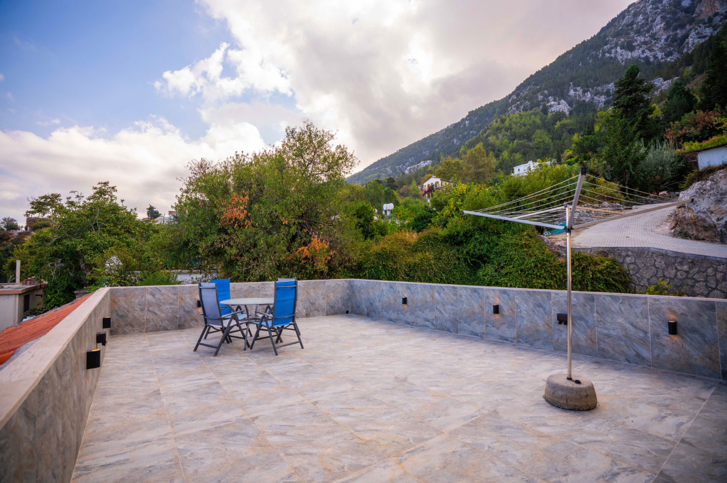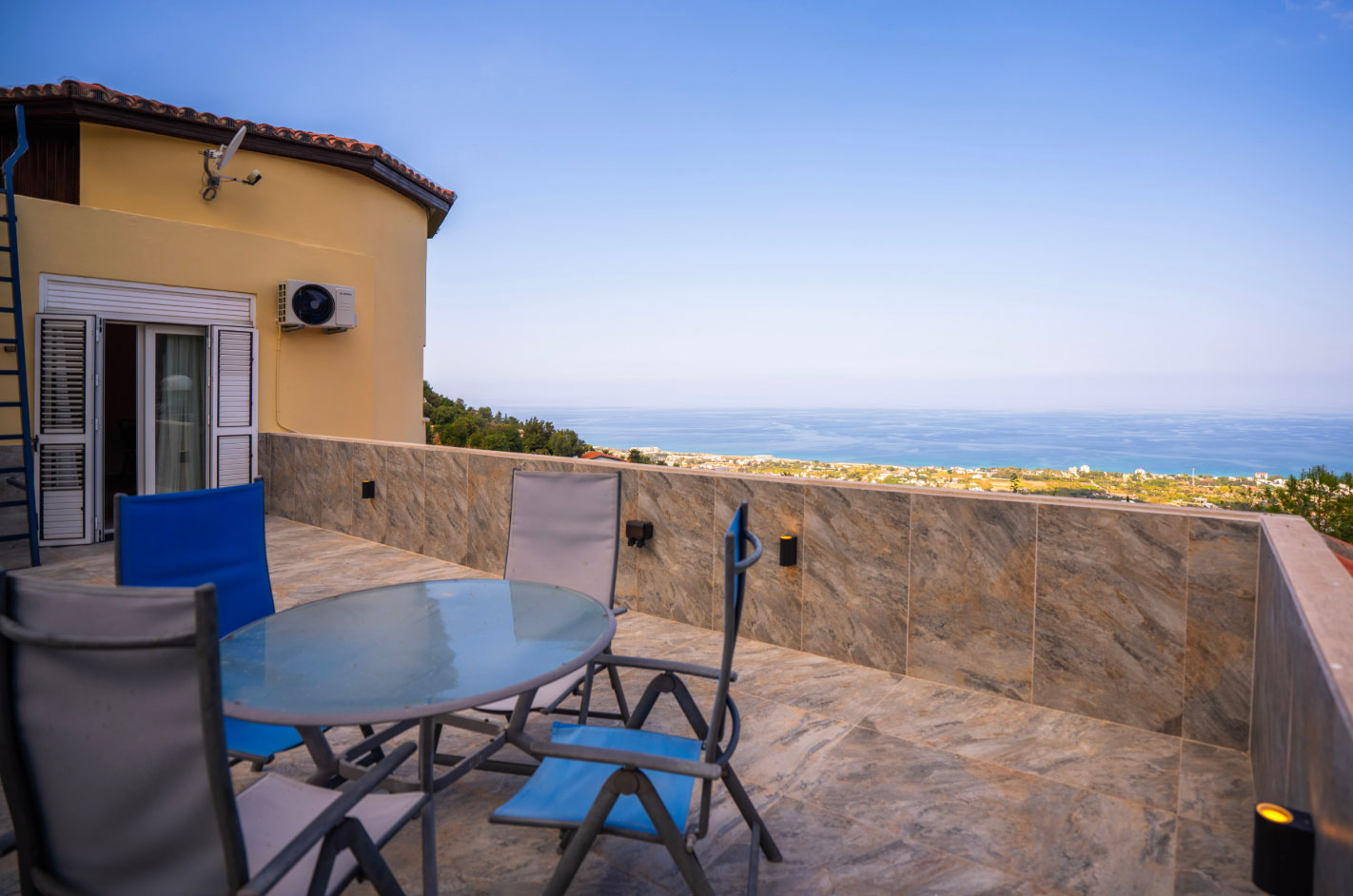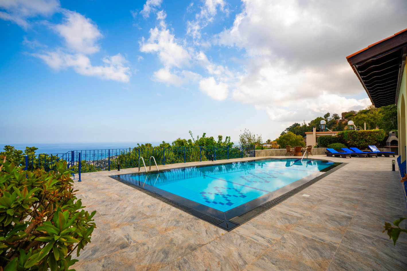 Set high in the mountains above the village of Baspinar, Lapta, Jewel Villa is a 4-bedroom lovely holiday villa offering spectacular panoramic views of the cost and surrounding village. The location is a drive up the mountain on a peaceful country lane. The villa offers 4 bathrooms with 3 en-suite, a swimming pool and a great outdoor area with covered terrace.