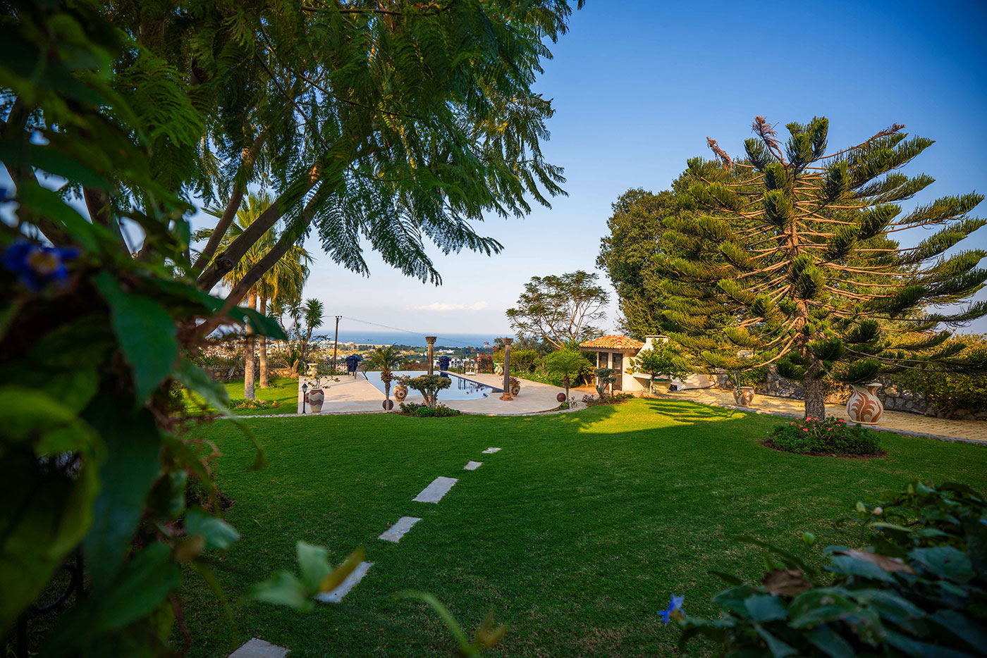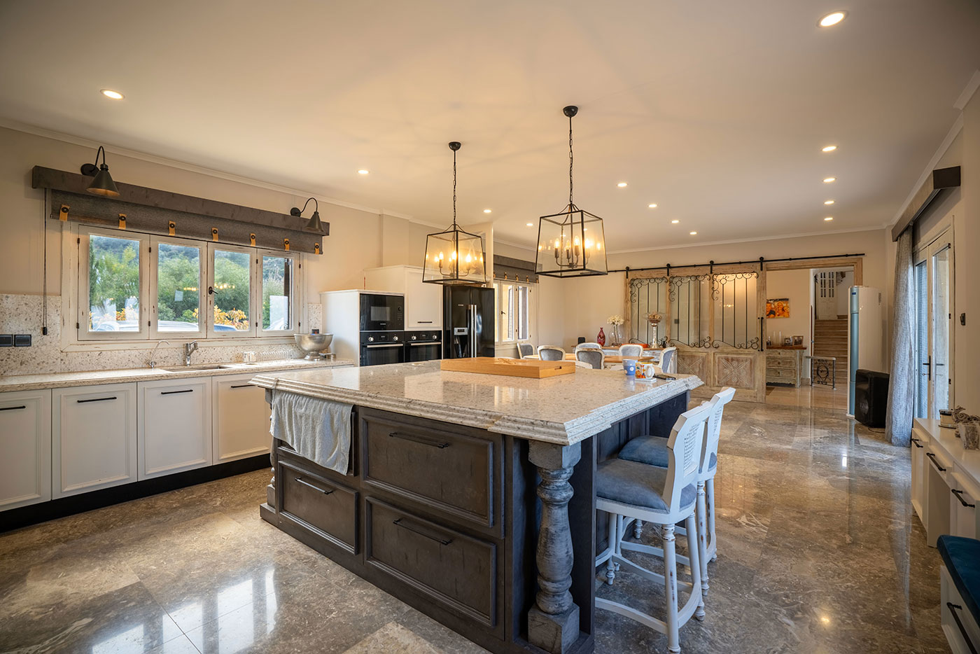The fully equipped kitchen features high-end appliances including a fridge, freezer, electric oven, microwave, dishwasher, and electric kettle—plus all essential cookware. The expansive outdoor areas offer a private terrace with lush garden views, sun loungers, and shaded seating, all set against a breathtaking natural backdrop.