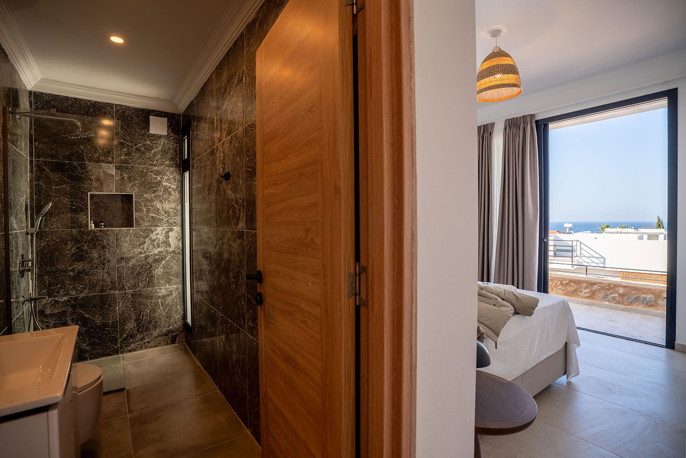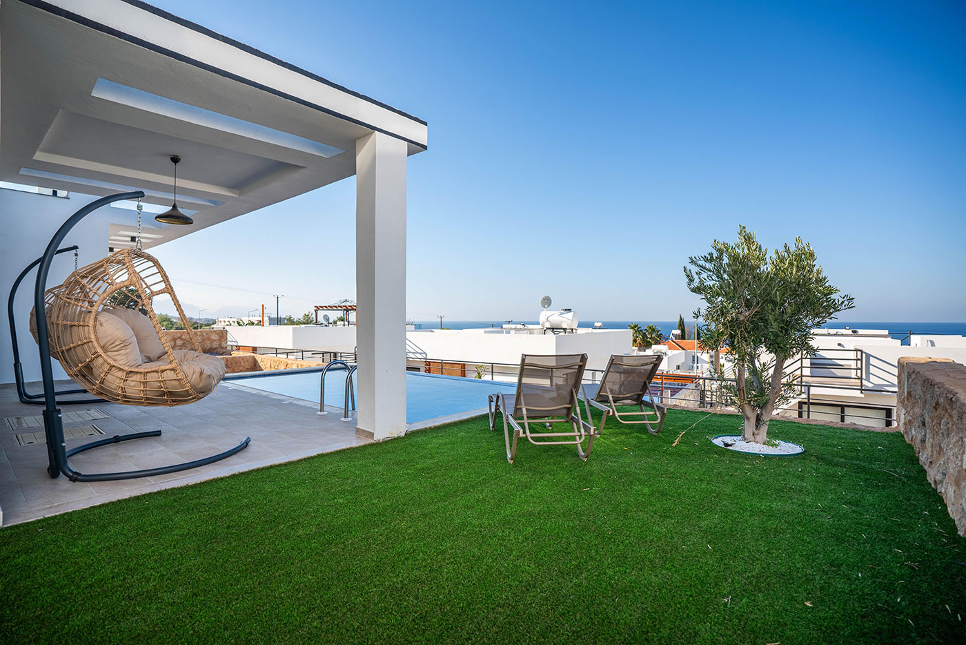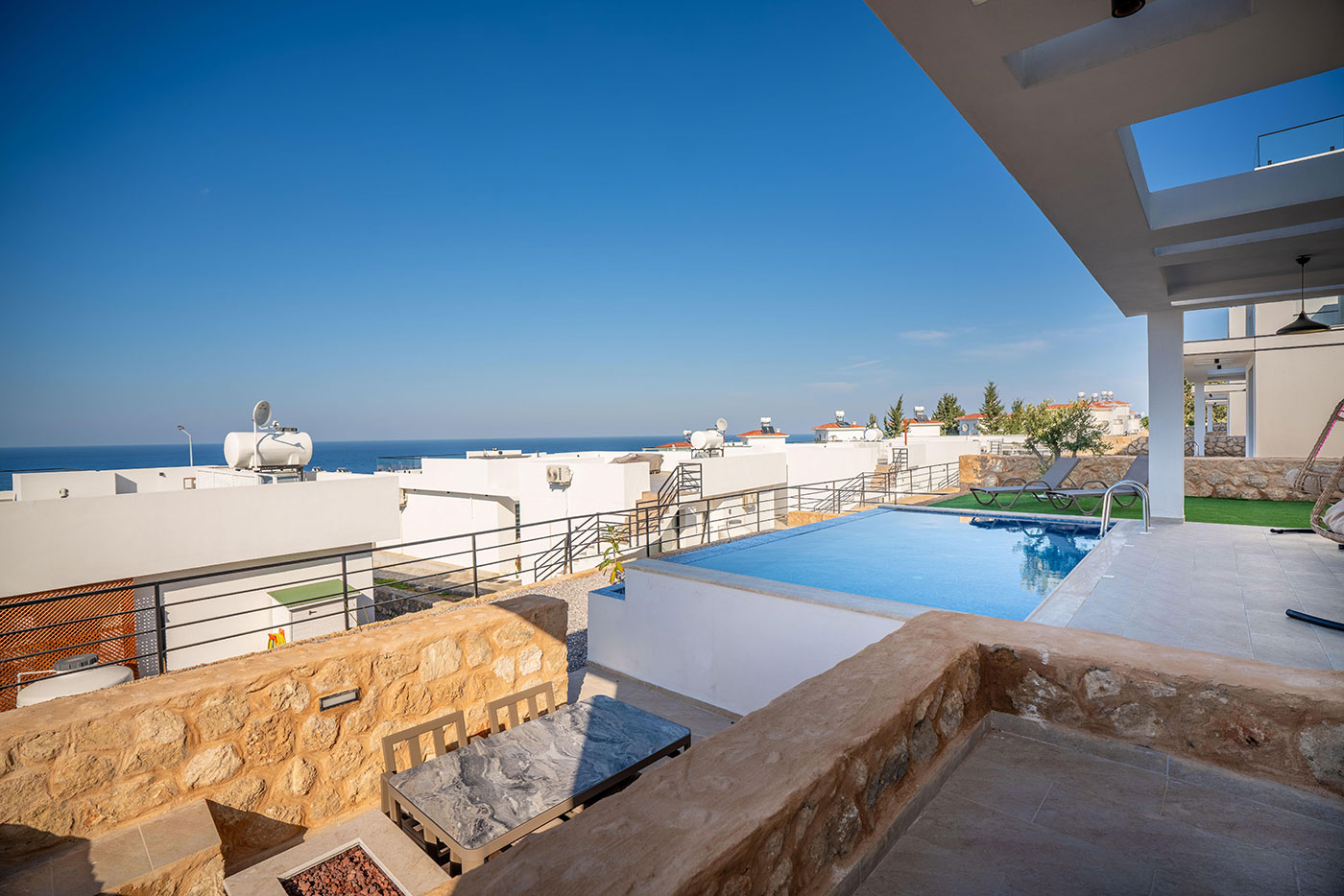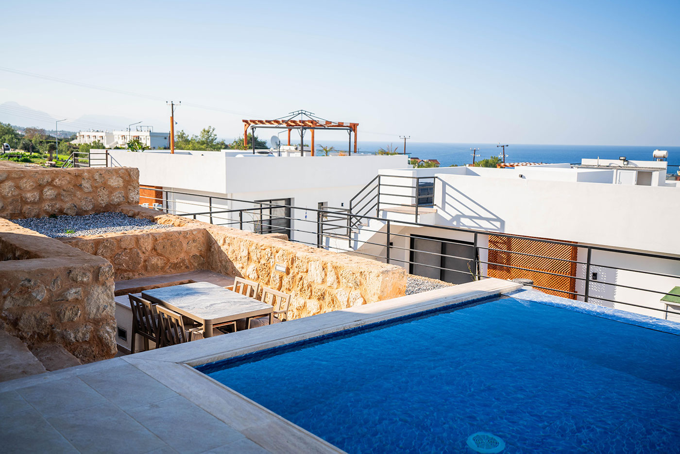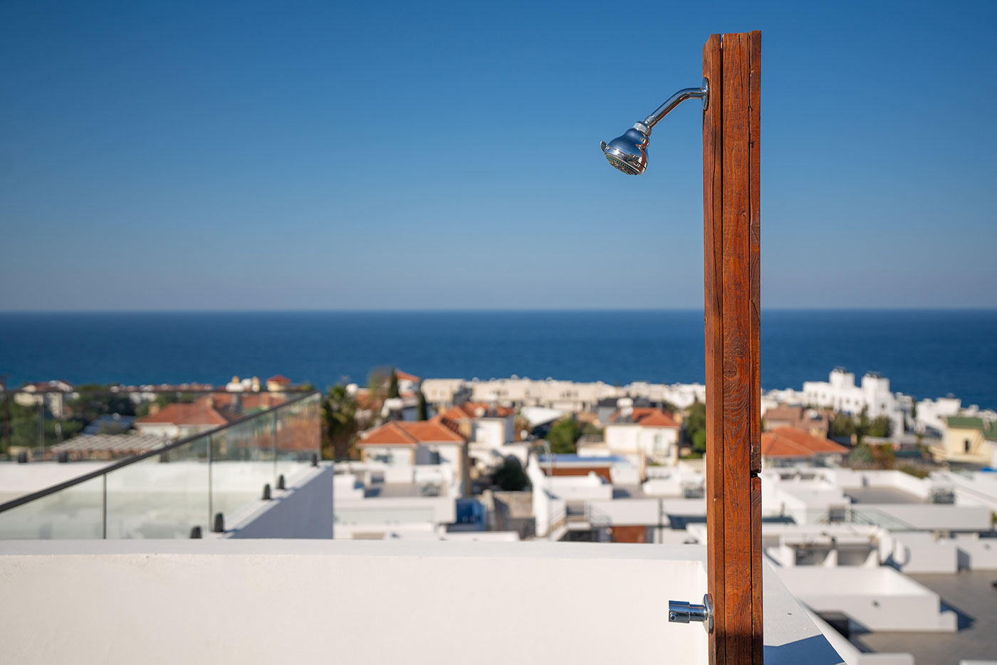 Your mornings can begin on the balcony, where you can sip coffee and soak in the breathtaking views of the surrounding landscape. For afternoon relaxation, the private pool offers a serene space to swim and sunbathe. As the day comes to a close, head up to the roof terrace to freshen up with an outdoor shower, all while taking in the spectacular vistas of the region.