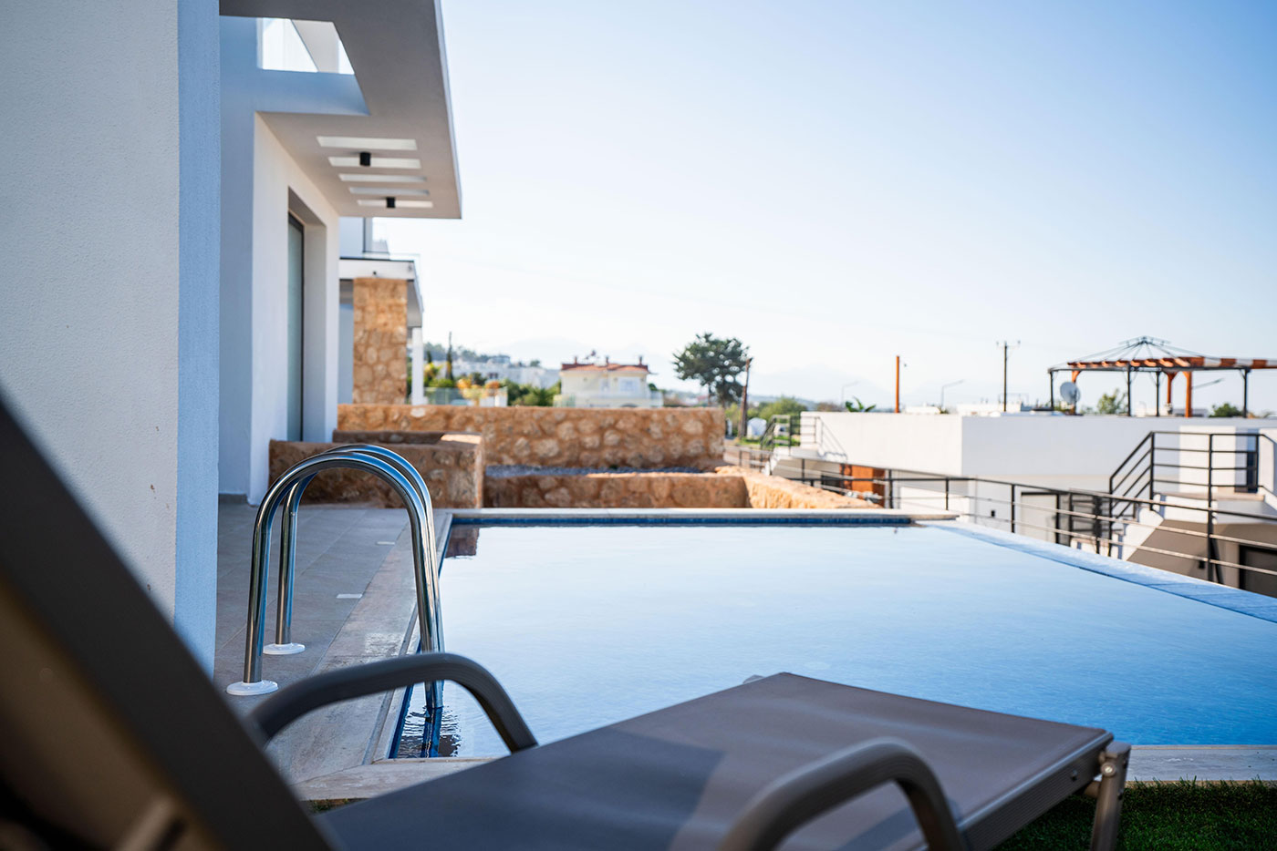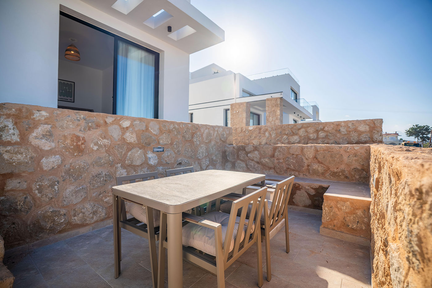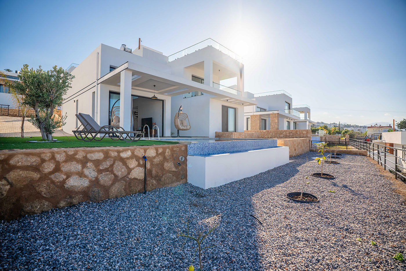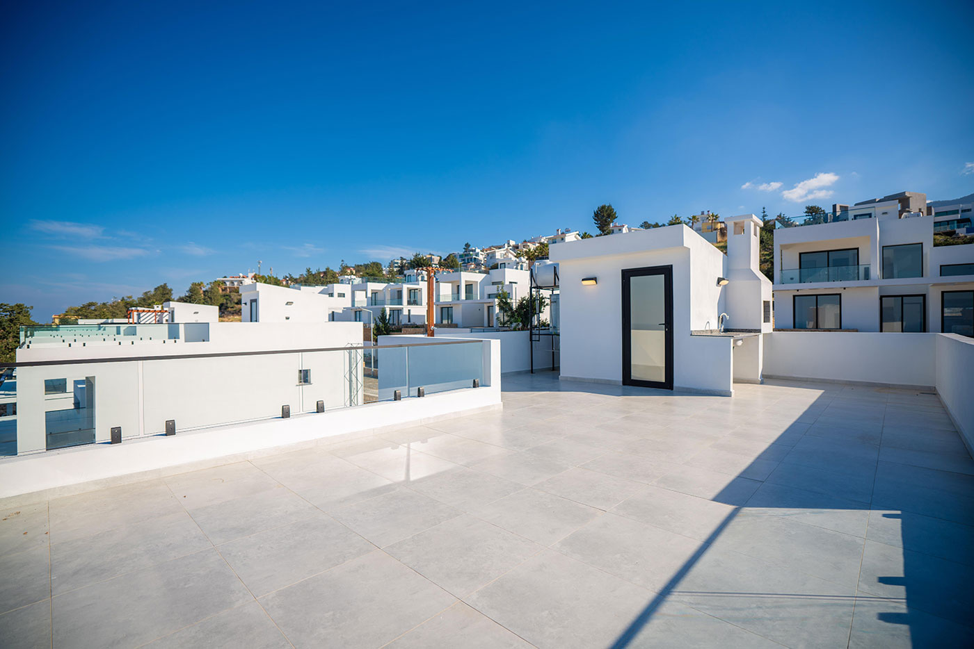 Your mornings can begin on the balcony, where you can sip coffee and soak in the breathtaking views of the surrounding landscape. For afternoon relaxation, the private pool offers a serene space to swim and sunbathe. As the day comes to a close, head up to the roof terrace to freshen up with an outdoor shower, all while taking in the spectacular vistas of the region.