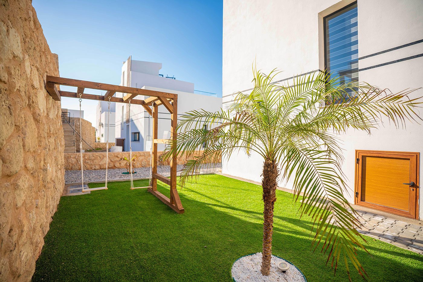 Families with children will appreciate the dedicated play area with outdoor furniture and sunbeds, ensuring a safe and fun environment for kids. Additionally, the house is equipped with everything needed for a hassle-free stay, including a washing machine, dryer, and linens.